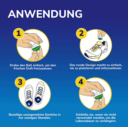 As bolas desodorizantes para sapatos da Scholl oferecem uma solução eficaz para o controlo de odores em sapatos e outros locais de armazenamento. Clinicamente testados, eles são particularmente adequados para pessoas com diabetes. A fórmula fornece instantaneamente ar fresco e mantém os odores desagradáveis afastados por até 12 horas. Seja em sapatos, bolsas esportivas, mochilas ou armários - com essas bolas desodorantes, tudo fica livre de odores e agradavelmente fresco.