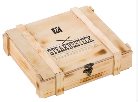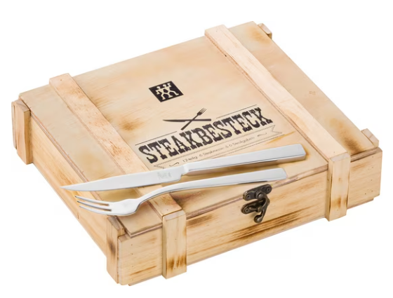 Se você prepara seus bifes perfeitamente, é claro que não deve prescindir dos talheres certos. O conjunto de talheres de bife de 12 peças da ZWILLING é o companheiro ideal para churrascos ou outras ocasiões para servir bifes suculentos com estilo. As facas de bife incluídas cortam a carne suavemente e têm o formato típico de lâmina cônica. O acabamento de alta qualidade dos talheres em aço inoxidável 18/10 em um design brilhante é complementado pela caixa de madeira rústica para armazenamento. Assim, o conjunto, que consiste em 6 facas e 6 garfos cada, também pode ser dado como um presente maravilhoso para os conhecedores.